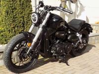 Keeway RK V125 C is a modern take on the classic V-twin cruiser, combining timeless design with up-to-date components for the contemporary rider. Featuring a new 125cc V-twin engine with 6 valves, liquid cooling, and electronic fuel injection, the RK V125 C delivers peak figures of 10.2kW of power and 14.4N·m of torque, more than enough to push the 164kg (dry) motorcycle. Unlike other motorcycles of its size, the RK V125 C comes equipped with inverted front forks and front and rear disc brakes, ensuring optimal performance and handling. Thick 120/80-17 and 140/70-17 tires adorn the front and back, respectively, adding to the low and wide cruiser look. The 2-into-1 exhaust provides a clean view of the polished engine case while emitting the distinctive rumble of a V-twin. The chain final drive ensures optimal comfort and minimal maintenance. The electronics of the RK V125 C are also thoroughly modernized, featuring a thin, round headlight that projects the Keeway logo on the DRL, producing a 3D effect when combined with the LED low- and high-beam lamps. The instrument cluster is circular and features a white-on-black digital display highlighted by a radial tachometer around the speedometer. The tank of the RK V125 C is wide in proportions and comes in solid red or black finishes. Holding a massive 19 liters of fuel, it gives the RK V125 C class-leading range with just one fill-up, perfect for those never-ending road trips. The low 690mm seat height ensures comfort for riders of all sizes. Overall, the Keeway RK V125 C is a stylish and reliable motorcycle that is perfect for those looking for a modern take on the classic cruiser. With its sleek design, up-to-date components, and class-leading range, the RK V125 C is the perfect bike for those looking to hit the open road.