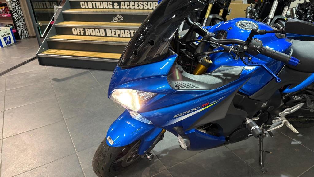 The naked-style single headlight GSX-S1000 is equipped with angular radiator shrouds that enhance the aggressive image and aid cooling performance.